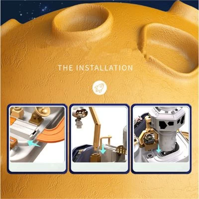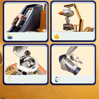 Lieferumfang: Hauptkörper * 1, kaputte Brücke * 1, Asteroid * 2, C-förmige Umlaufbahn * 1, Vulkan * 1, Radar * 1, Geländer * 4. Schienenhalterung * 2, Rakete * 1, Raketengestell * 1, Weltraumkran * 1, Zeichentrickauto * 3, Astronaut * 1, Raumschiff * 1